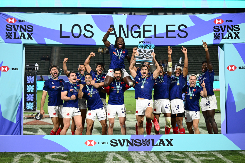 - Robin GREMMEL / AFP | Crée le 04.03.2024 à 14h51 | Mis à jour le 04.03.2024 à 14h51ImprimerLes joueurs français célèbrent leur victoire au tournoi HSBC Rugby Sevens de Los Angeles 2024, après avoir infligé une lourde défaite (21-0) à la Grande-Bretagne. Photo Patrick T. Fallon / AFPL’équipe de France de rugby à VII et sa nouvelle vedette Antoine Dupont ont remporté le tournoi du circuit mondial de Los Angeles ce lundi, une première pour les hommes depuis 2005 qui les lance parfaitement vers leur objectif olympique.