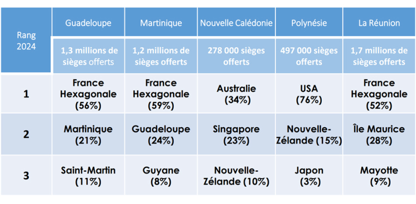 En 2024, 278 000 sièges étaient offerts en direction de la Nouvelle-Calédonie, d’après Atout France. Tableau Atout France"La clientèle touristique aérienne est relativement stable en 2024, comparativement à l’année précédente (estimation de près de 2 millions de touristes aériens)", ajoute le document. Cette stabilité masque cependant des disparités, avec des progressions pour La Réunion (+ 11 % : augmentation de la clientèle depuis la France hexagonale, Maurice et Madagascar) et la Martinique (+ 7 % : hausse depuis la France hexagonale et l’Amérique du Nord) et des baisses très importantes pour d’autres territoires comme la Nouvelle-Calédonie (-40 % par rapport à 2023).