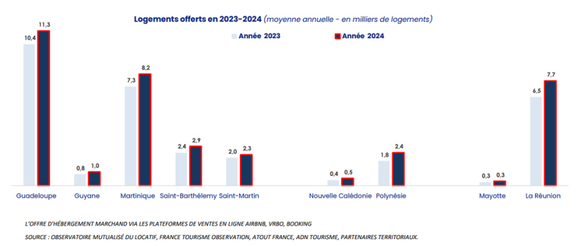 L’offre et la fréquentation (+ 11 % pour cette dernière) sont en augmentation. "Avec environ 37 000 logements en 2024 sur l’ensemble de l’Outre-mer, l’offre locative progresse de 15 % par rapport à 2023, et ce sur l’ensemble des destinations suivies. Sur 10 logements mis à la location : 3 le sont à La Guadeloupe, 2 à la Martinique et 2 à La Réunion", note le rapport. Ces trois destinations représentent en effet les trois-quarts de la fréquentation. Atout France constate une relative stabilité du taux d’occupation à 36 %. À noter que la Polynésie (avec 7 % du parc ultramarin) enregistre le taux d’occupation le plus élevé (47 %) suivie de La Réunion (43 %). La Polynésie enregistre également le plus fort taux d’augmentation de son parc d’hébergement (+ 33 % contre + 15 % en moyenne en 2023).