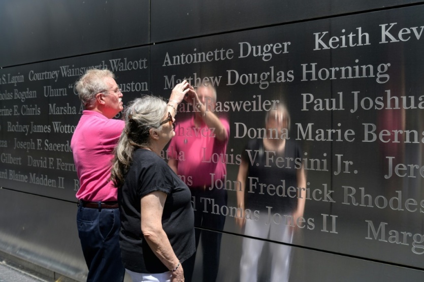 Diane et Kurt Horning, parents de Matthew disparu le 11 septembre 2001 dans l'attaque du World Trade Center, cherchent le nom de leur fils à l'Empty Sky Memorial, le 15 juin 2021 à Jersey City Angela Weiss [AFP/Archives]
