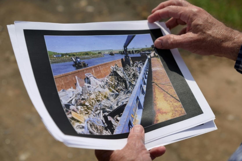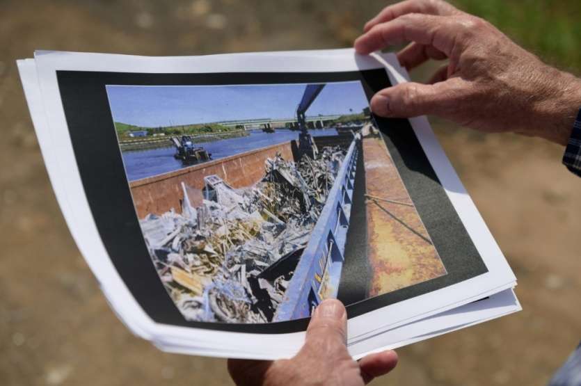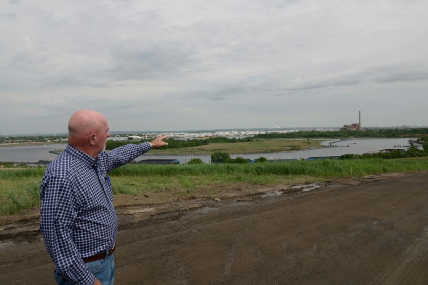 Dennis Diggins montre le canal emprunté par des barges en 2001 pour apporter les débris du World Trade Center sur le site de Fresh Kills, le 28 mai 2021 à Staten Island Angela Weiss [AFP]
