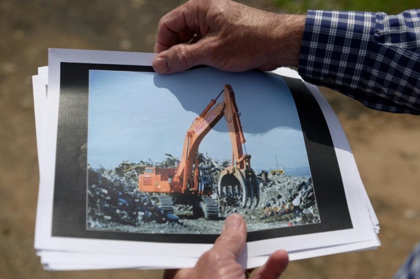 Dennis Diggins montre la photo d'une pelleteuse en 2001 au milieu des débris du World Trade Center à Fresh Kills, le 28 mai 2021 à Staten Island Angela Weiss [AFP]