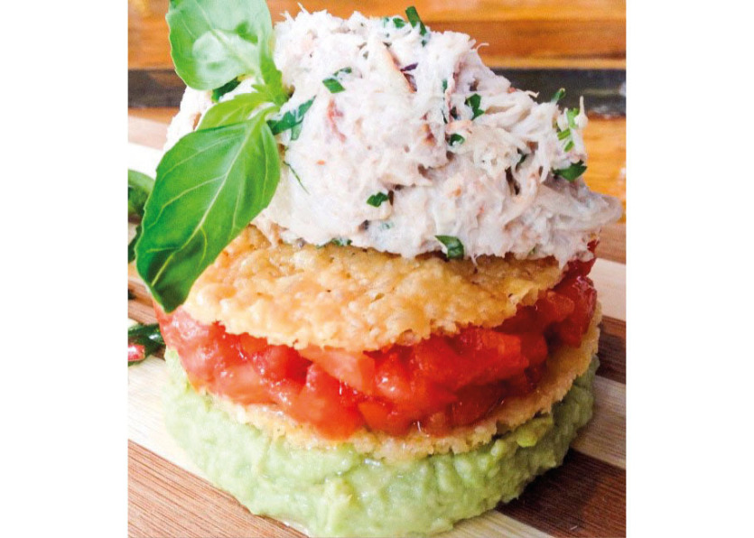 5. Assemblez le mille-feuille : dans une assiette, alternez une couche de préparation à l’avocat, une tuile, une couche de préparation à la tomate, une tuile et terminez par une quenelle de préparation à la chair de crabe.