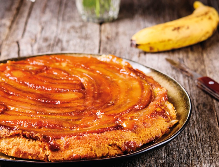3. Disposez les tranches de bananes dans un moule à tarte. Recouvrez avec la pâte feuilletée.