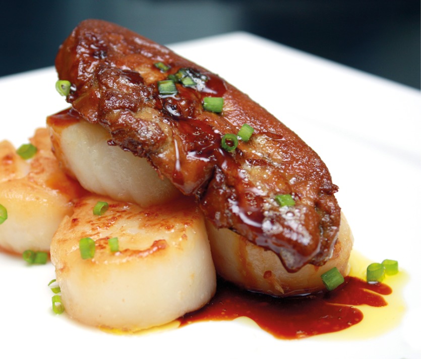 Pétoncles et foie gras au grué de cacao en entrée