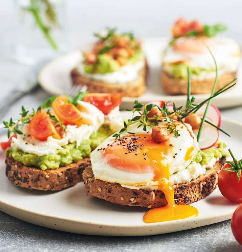 2. Nappez les tartines de mélange à l’avocat et de fromage, déposez un œuf poché sur chacune et servez aussitôt ! Vous pouvez agrémenter vos tartines avec des tomates, des radis et les décorer d’herbes fraîches.