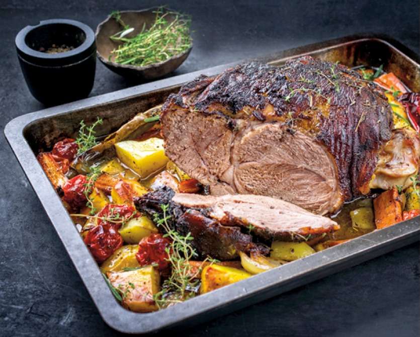 10. Enfournez à nouveau pendant 30 minutes. Vérifiez la cuisson de la viande avant de la sortir du four. Déposez le gigot dans un plat de service entouré des légumes et servez sans attendre.