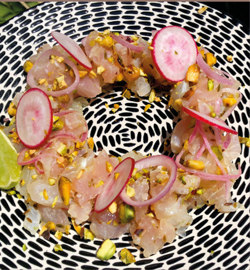 5. Dans un bol, mélangez les dés de poisson, le jus d’un citron, les zestes de combava (ou de citron), le cumin, l’échalote, l’huile d’olive, le miel et une partie des pistaches (réservez le reste pour la finition).