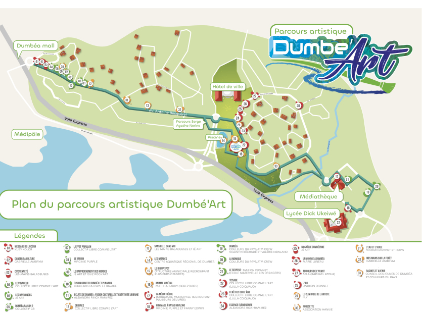 Carte du parcours Dumbé’Art. Ville de Dumbéa.Le parcours Dumbe’Art est à admirer à pied au départ du pont des Érudits, en suivant la rue Becquerel, puis en visitant les deux parcs, le parcours Serge-Agathe-Nerine et celui de Koutio, en passant par la piscine, puis le Big Up Spot, en tournant autour de du quartier Koutio Secal, puis, en arrivant au Cœur de ville, en se rendant à la médiathèque, puis au Lycée Dick-Ukeiwë. De nombreux artistes s’expriment ainsi sur les murs de la ville : Gabrielle Ambrym, Lulla, Kuby, Alejandra Rinck-Ramirez, Virginie Purple, mais également des collectifs : Les mains baladeuses, Couleurs pays, Libre comme l’Art… Une initiative qui permet d’embellir les rues de Dumbéa, d’apporter de la couleur, de faire vivre les artistes.