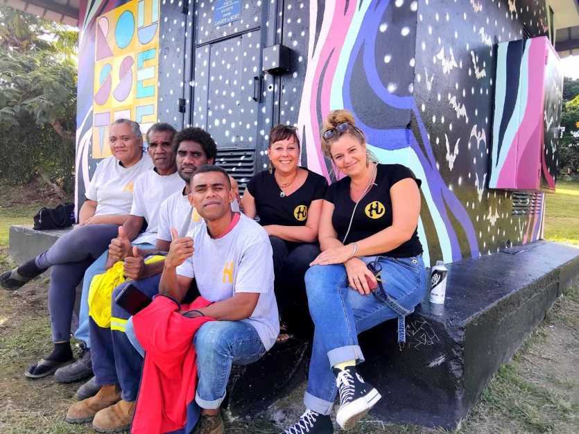 L’équipe d’Hanvie est très fière de présenter son œuvre Roussette qui s’empare des quatre façades de ce transformateur électrique de l’avenue Antoine-Becquerel. Photo Anthony Tejero"Ces œuvres s’en sortent bien et ont passé les différentes crises parce qu’elles sont réalisées par de vrais artistes sur des thématiques et avec des techniques différentes. C’est quelque chose dont on est tous très fiers dans la commune, estime le maire Yoann Lecourieux. Ces fresques, qui embellissent vraiment le quotidien, on les voit aussi comme un moyen pour que les gens s’approprient leur quartier afin de contribuer à ce qu’ils se créent une identité dumbéenne propre."