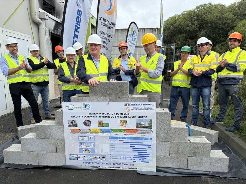 - A.D. | Crée le 22.08.2025 à 13h06 | Mis à jour le 03.09.2025 à 09h11ImprimerPremière pierre du chantier de reconstruction de la Station d'épuration de Dumbéa, avec le maire, Yoann Lecourieux, et le directeur de la Calédonienne des eaux, Luc Bourgade. Photo Aurélia DumtéLes locaux administratifs de la station d'épuration de Dumbéa, détruits lors des violences de mai et juin 2024, sont en cours de reconstruction à l'identique. Un chantier de 127 millions de francs CFP, qui fait travailler près d'une quinzaine de sociétés du BTP.