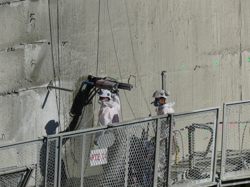 Les ouvriers procèdent à la découpe du seuil de déversement, afin de l’élargir et de laisser passer une plus grande quantité d’eau, réduisant ainsi la pression exercée sur le barrage. Photo Baptiste GouretIl fait l’objet d’un vaste chantier de mise en conformité mené par le gouvernement, visant notamment à garantir sa résistance face à une crue millénale (dont le risque de survenue dans une année est de 1 sur 1 000 et qui équivaut à un débit de 2 360 m3/s). Il était, jusqu’ici, largement sous-dimensionné et ne répondait plus aux normes françaises. En 2016, une revue de sûreté avait pointé la capacité insuffisante de l’évacuateur de crue, dimensionné pour supporter simplement une crue centennale.