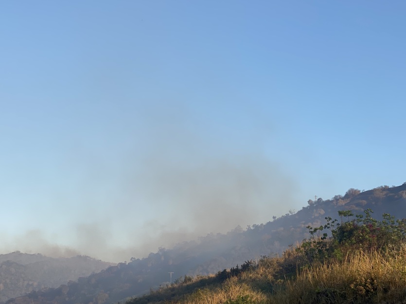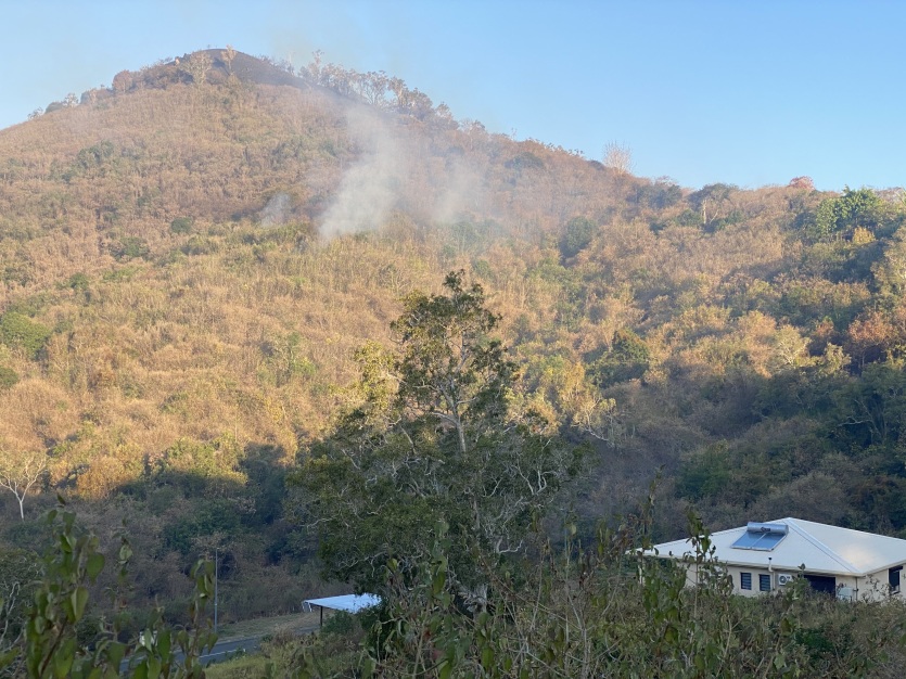L’odeur de fumée est forte à Dumbéa-sur-Mer, de la Zac Panda à la mairie de Dumbéa. Le soleil couchant créé une luminosité orangée dense avec la fumée provoquée par le gros incendie qui a débuté mardi en début d’après midi.