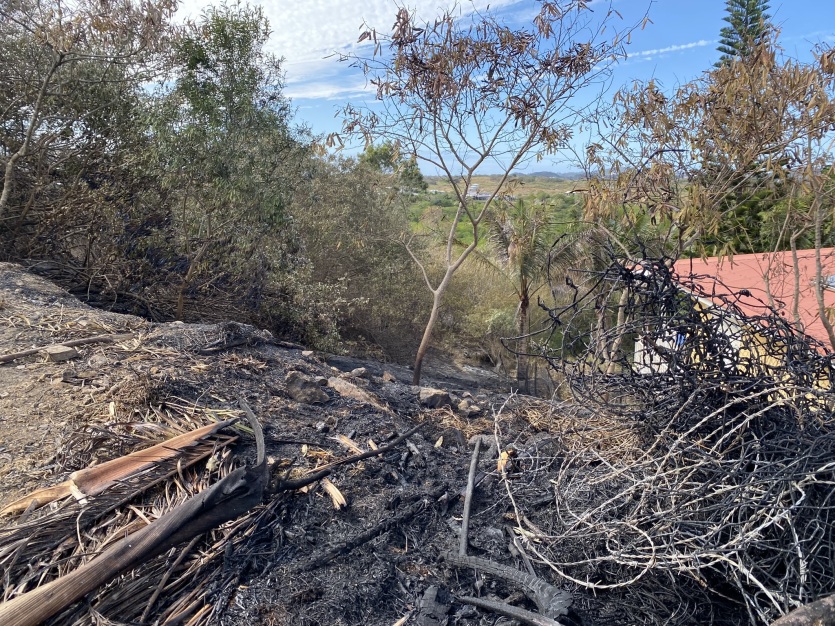Les terrains voisins ont été grandement touchés par l’incendie volontaire, si les maisons ont été préservées, les jardins, les murs, les barrières, tout est parti en fumée. Photo A.D.Avec le vent et la sécheresse, hier, le feu a très vite atteint les terrains habités, détruisant entièrement les jardins, les cabanons. Les murs des maisons voisines sont noircis de suie, les barrières détruites, les climatiseurs, les sous-forgés ont fondu. Une dizaine de terrains ont été touchés par les flammes, malgré le travail intense des pompiers de la ville, soutenus par la sécurité civile et des hélicoptères bombardiers d’eau. Alors qu’un hélicoptère intervenait de façon "spectaculaire", selon une voisine, sur l’incendie de la Pointe à la Dorade, un autre tentait de circonscrire l’incendie de brousse qui sévit depuis mardi après-midi à la Zac Panda.