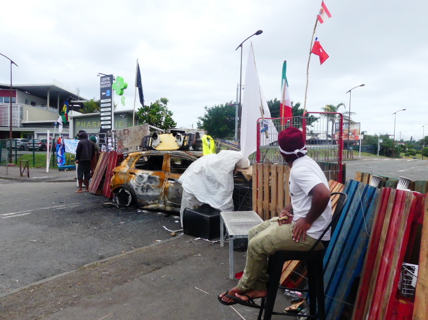 De part et d’autre du rond-point, entre le lycée Dick-Ukeïwé et le cinéma MK2, ils sont nombreux à se mobiliser pour réguler la circulation et aider les automobilistes à se frayer un chemin parmi les nombreuses carcasses brûlées sur les routes. Dans ce secteur du centre urbain de Koutio, les militants l’assurent : les barrages sont "filtrants" et "pacifiques".