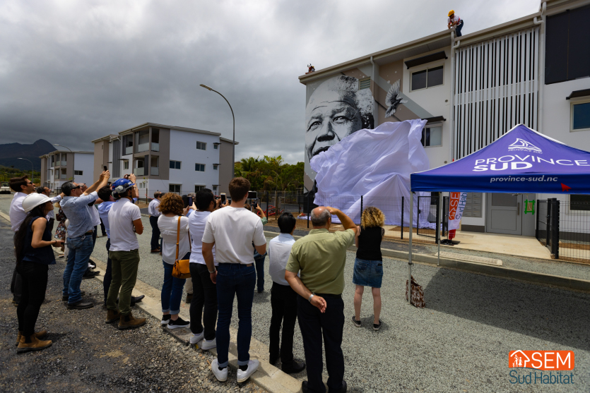 - A.T. | Crée le 17.11.2023 à 07h08 | Mis à jour le 17.11.2023 à 08h39ImprimerLa citation sur ce bâtiment " s’adresse également aux habitants de cette résidence, ou aux passants, pour rappeler que chacun, à sa façon, peut contribuer à sublimer le monde qui nous entoure", estime la présidente de la Sem Sud Habitat. Photo DRLe nouveau projet porté par le bailleur social Sem Sud Habitat, a été inauguré jeudi matin, à Dumbéa. Singularité de ce nouvel ensemble résidentiel de 35 logements : un portrait grandeur nature de Nelson Mandela a été peint sur l’une des façades.