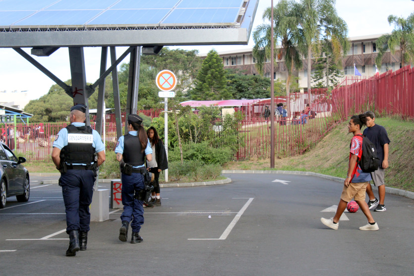 - Comme c'est le cas deux fois par semaine depuis le début de l'année, une opération de sécurisation a été réalisée par une vingtaine de gendarmes, ce vendredi, au sein du lycée Dick-Ukeiwë et ses alentours. L'objectif étant de sécuriser et maintenir la tranquillité publique de cette zone, souvent le lieu de rixes entre lycéens.À leur passage, on s'écarte et on les observe. Dans certains cas, leur présence suffit à faire taire les débuts de conflit. Facilement reconnaissables par leur uniforme bleu, ils maintiennent la sécurité ici et aux alentours. Ce vendredi après-midi, une vingtaine de gendarmes de Dumbéa,Il vous reste 92% de l'article à découvrir.Cet article est réservé aux abonnés.