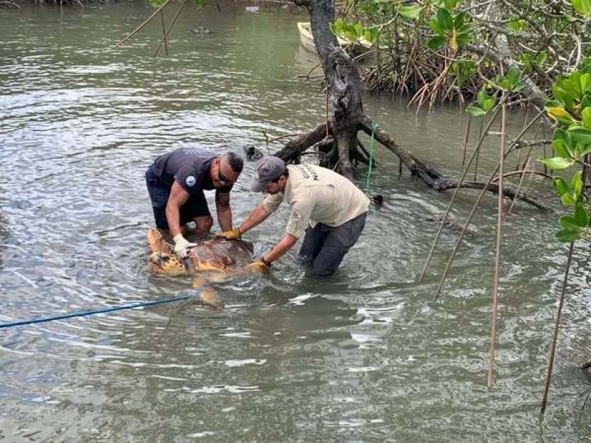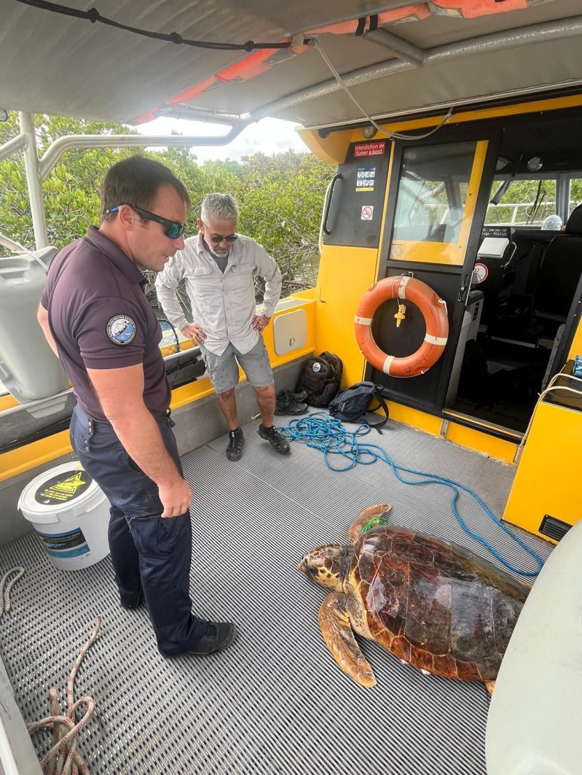 Les faits se sont déroulés dimanche 14 septembre. La gendarmerie les a relatés dans une publication sur les réseaux sociaux mardi 16 septembre. La brigade nautique est intervenue dimanche 14 septembre en renfort des gardes nature de la province Sud, après qu’une tortue grosse tête a été découverte attachée dans la mangrove de Dumbéa, a priori retenue depuis plusieurs jours.