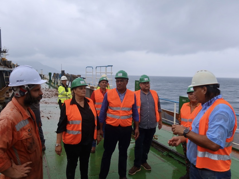 Le président du gouvernement, Alcide Ponga, et la maire du Mont-Dore, Elizabeth Rivière, ont visité le minéralier l’Afros, affrété par MKM, présenté par le directeur Christian Taupua (à droite). Photo Gouvernement NCMERCI DE VOUS IDENTIFIER