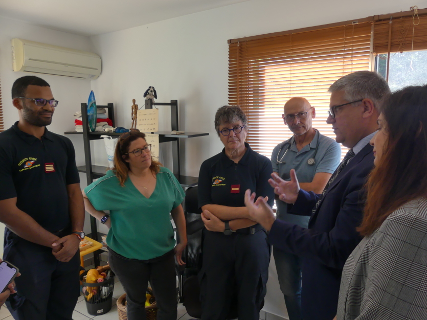 Sonia Backès, présidente de la province Sud, Grégory Lecru, commissaire délégué, et Nina Julié, élue provinciale, aux côtés du Dr Joachim et de l’infirmière Véronique, dans le cabinet médical de La Corniche, où les deux professionnels de santé assureront désormais des permanences tous les week-ends. Photo Baptiste GouretL’arrivée du Dr Joachim et de l’infirmière Véronique représente donc "un moment important pour les Mondoriens", juge Sonia Backès, présidente de la province Sud, qui met à disposition le cabinet médical. "Il y a quelque chose qui devient inquiétant dans certains endroits de Nouvelle-Calédonie, c’est la perte de chance. C’est le cas ici, où l’on ne peut pas se soigner si on est en danger. On ne peut pas se permettre une telle situation en République française."