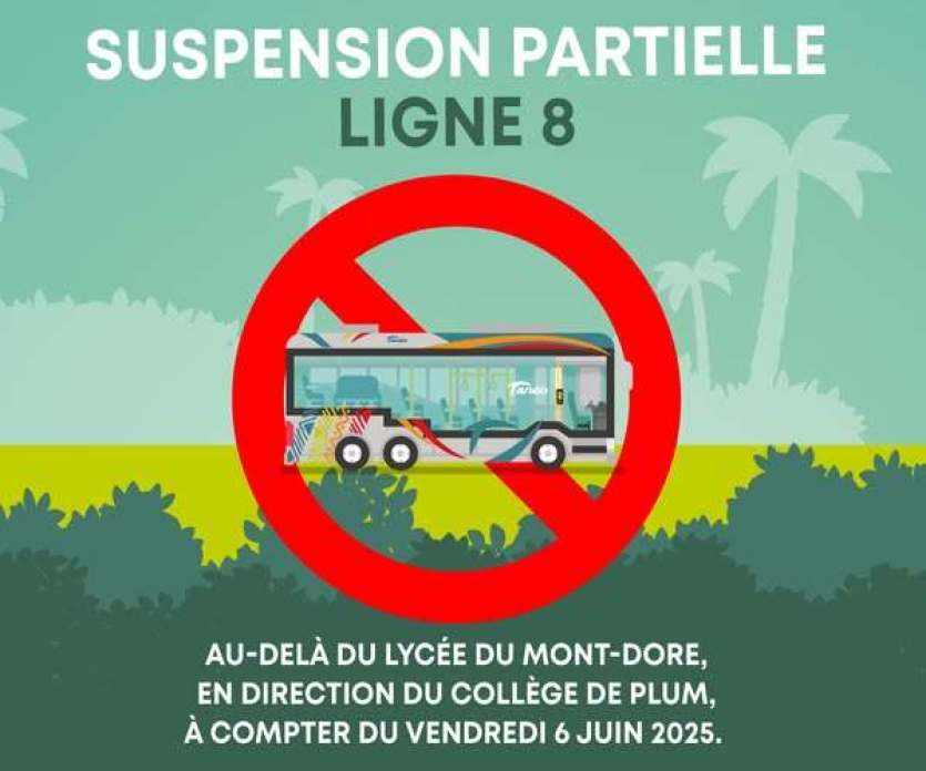 À la suite de "plusieurs incidents de caillassage survenus ces derniers jours", indique Tanéo sur sa page Facebook, le transporteur informe être "contraint" de suspendre partiellement le service de la ligne L8 au-delà du lycée du Mont-Dore en direction du collège de Plum, à compter du vendredi 6 juin. Une décision prise "dans le souci de garantir la sécurité des usagers et du personnel".