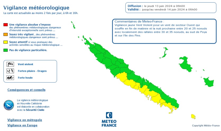 Il n’y aura pas de service de navettes maritimes ce jeudi après-midi, annonce Tanéo. En cause, des conditions météorologiques défavorables à la navigation prévues à partir de ce midi. Météo France a en effet placé les communes de la côte Ouest entre Poya et l’île des Pins en vigilance jaune vent violent, avec des rafales entre 30 et 35 nœuds dès la fin de matinée et jusqu’à la nuit prochaine.