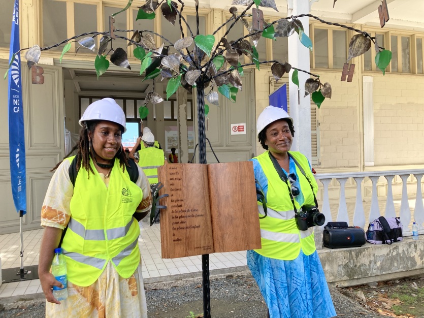 "L’Arbre à l’Être" est une œuvre réalisée par des jeunes de la DPJEJ. Sur le livre tenu par l’arbre, un extrait du poème "Écrire" de Déwé Gorodey a été gravé. Photo Baptiste GouretSymbole d’unité et des liens à la nature, la culture et la famille, cette création a été réalisée par des jeunes de la protection judiciaire, de l’enfance et de la jeunesse (DPJEJ) à partir de matériaux issus des bâtiments détruits de Bernheim, et notamment les marches de l’escalier de l’ancienne bâtisse.
