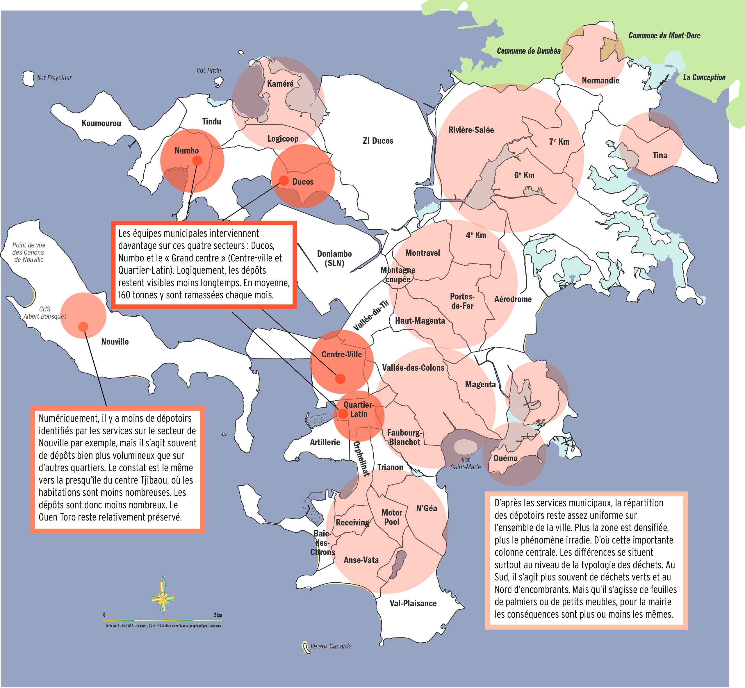 - Stéphanie Chenais / stephanie.chenais@lnc.nc | Crée le 05.04.2018 à 04h25 | Mis à jour le 05.04.2018 à 07h15ImprimerLes services de la ville travaillent sur une autre carte que celle-ci. Un document interne localisant chaque dépôt sauvage avec une photo correspondante qui leur a permis de tirer les grandes tendances ci-dessus. Photo Infographie Patricia CrezenEnvironnement. Le problème n’est pas nouveau, mais face aux dépôts sauvages qui apparaissent sans discontinuer, la mairie assure qu’elle va durcir le ton. Une communication de proximité va bientôt commencer.