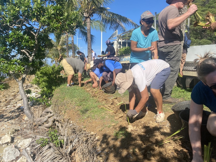 Le travail est organisé en deux temps. D’abord une ligne de vétiver à disposer sur le haut du talus. Ensuite, des plantations plus bas, au plus près du bord de mer. Les trous ont déjà été préparés par l’équipe de Caledoclean. Il ne reste plus qu’à planter, tasser, puis pailler. "L’idée, c’est d’avancer ensemble", résume Thibaut Bizien en détaillant avec précision les gestes à effectuer.