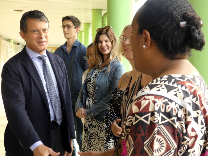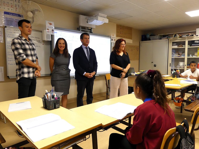 Le ministre a visité plusieurs salles de classe. Photo Baptiste Gouret"La Banque alimentaire nous apporte de l’aide, notamment pour leur offrir un petit-déjeuner", repas dont ils sont régulièrement privés à la maison. Désormais, le seul repas sur pour une partie d’entre eux est celui proposé par la cantine des écoles. "On a 150 élèves sur 260 qui mangent tous les jours à la cantine, c’est beaucoup, ce qui montre que l’aide à la cantine et les bourses participent à un mieux-être", estime la cheffe d’établissement. Pour Manuel Valls, cette situation met en lumière la nécessité de poursuivre la mise en œuvre de l’accord de Bougival et son "pacte" économique et social, qui aborde la question de la jeunesse. "Le projet de société, l’école, la formation, l’emploi… C’est autour de cela qu’on reconstruira la Nouvelle-Calédonie."