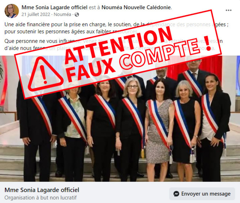 "Mme Sonia Lagarde Officiel" ou "Mme Sonia Lagarde". Derrière ces intitulés de profils Facebook se cachent en fait "des escrocs", avertit la ville de Nouméa dans une publication diffusée sur les réseaux sociaux. Ces derniers "usurpent l’identité du maire de Nouméa sur internet (notamment sur Facebook et la messagerie Messenger) dans le seul but de vous soutirer de l’argent", met en garde la municipalité.