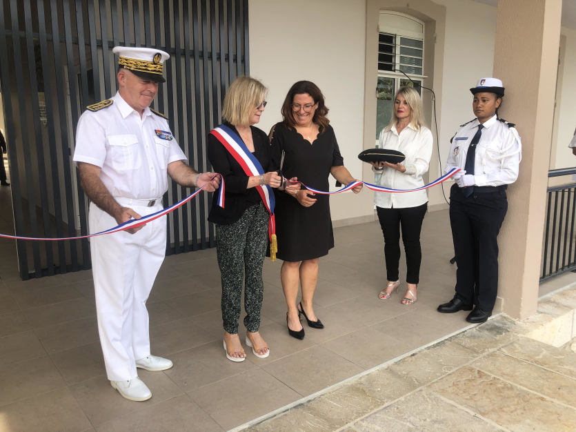 Sonia Lagarde a procédé à l’inauguration en coupant le ruban tricolore aux côtés de Sonia Backès et de Louis Le Franc, le haut-commissaire. Photo Patricia Calonne" L’ancien bâtiment de la rue Gallieni était devenu trop exigu pour loger convenablement notre police et en particulier notre centre de commandement opérationnel de vidéoprotection, a rappelé Sonia Lagarde, la mairesse. Les travaux de restauration ont débuté au premier trimestre 2022. Travaux qui ont permis l’agrandissement de l’unité de sécurité et d’intervention avec notamment la création d’un chenil plus spacieux pour accueillir un plus grand nombre d’auxiliaires canins et on sait tout le travail que font ces chiens. L’ensemble de ce projet a représenté un investissement total de près de 495 millions pour lequel nous avons bénéficié d’une aide financière de la province Sud de 50 millions et une aide de l’État pour réhabiliter le mur d’entrée de l’hôtel de police qui est un mur mitoyen que nous avons avec l’armée. "
