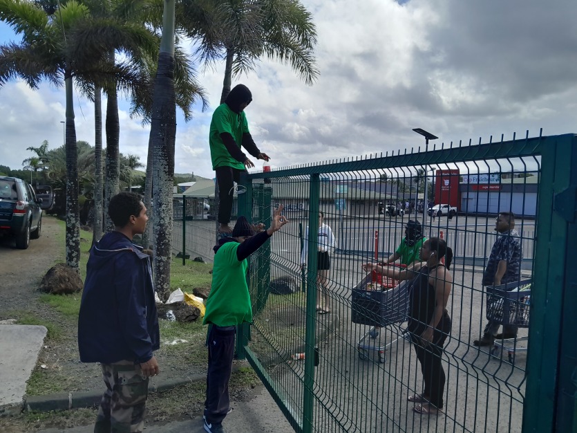Ces jeunes passent les courses de chaque côté du grillage pour faciliter la vie des clients. Photo Anthony TejeroMERCI DE VOUS IDENTIFIER