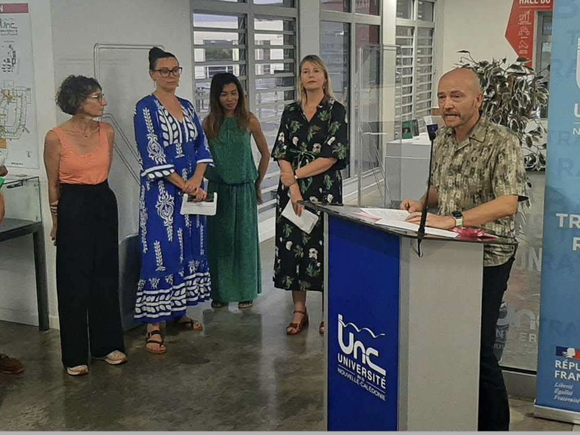 De gauche à droite lors du vernissage d’Archéxpo : Stéphanie Geneix-Rabault enseignante-chercheure à l’UNC, Emilie Dotte-Sarout archéologue à University of Western Asutralia, Audrey Dang, photographe en charge du design d’Archéxpo, la représentante du Consulat d’Australie en Nouvelle-Calédonie, et le vice-président de l’UNC, Stéphane Minvielle. Photo Laurence BachetLe vernissage s’est tenu mercredi 18 mars, en présence d’une centaine de personnes, dans une atmosphère particulièrement émouvante.