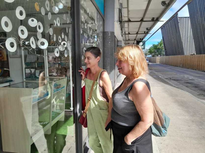 Scène insolite dans Nouméa, ces deux touristes s'occupent comme elles peuvent et s'arrêtent devant une vitrine de perles de Tahiti, au Quartier-Latin.Parmi les passants rencontrés ce matin dans Nouméa, quelques touristes, à l'image de Karine et Françoise, fraîchement débarquées sur le Caillou. Et qui auraient pu espérer accueil plus chaleureux... "Hier, nous devions récupérer une voiture à La Tontouta, nous avons pris le bus, mais il s'est arrêté à Païta et nous avons continué avec un taxi. Nous avons traversé plein de barrages avec des personnes cagoulées, c'était un peu chaud, racontent ces deux Métropolitaines, qui tentent de faire contre mauvaise fortune bon coeur. On ne connaît pas assez le pays pour savoir où est vraiment le danger. Pour l'instant, disons que c'est plutôt des inconvénients. Et ça nous fera des histoires à raconter quand on sera rentrées."