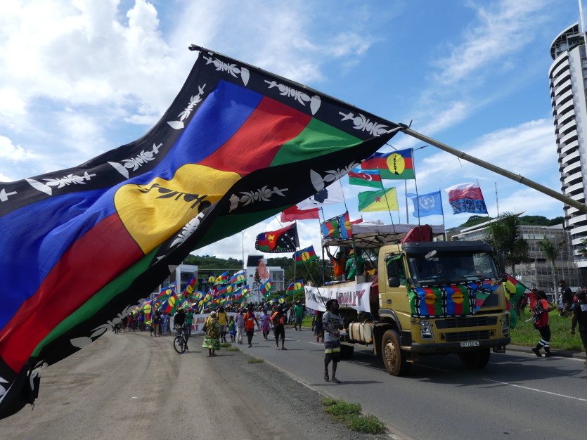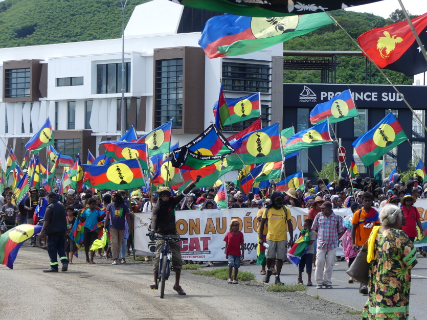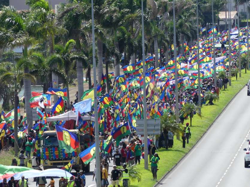 Les militants et sympathisants indépendantistes demandent le retrait du projet de loi constitutionnelle. Photo Baptiste GouretDès 8h30, les manifestants ont entamé leur marche du rond-point de Montravel en direction du Mwâ Kââ. Vers 11 heures, les premiers manifestants ont atteint le rond-point Berthelot. La mobilisation s’étendait sur plusieurs centaines de mètres. "D’où je suis, je ne vois pas la fin du cortège", s’est félicité un des speakers, perché sur le camion qui ouvrait la marche. La circulation a été fortement perturbée sur la Savexpress, en direction de Nouméa, ainsi que dans d’autres secteurs d’entrée de ville, comme Belle-Vie.