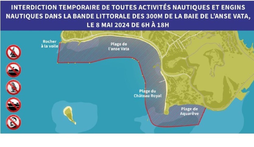 Les activités nautiques seront interdites de 6 heures à 18 heures sur une bande littorale de 300 mètres. Carte Ville de NouméaLe stationnement sera également interdit de minuit, ce mardi soir, à 20 heures mercredi soir, sur une portion de la promenade Roger-Laroque comprise entre la rue Michel-Laubreau et la rue Garbiel-Laroque.
