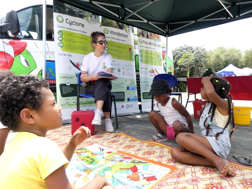 - Baptiste Gouret | Crée le 07.11.2024 à 05h00 | Mis à jour le 07.11.2024 à 05h00ImprimerAvec sa maquette simulant un tsunami et ses casques de réalité virtuelle, Julia Nouard, en charge du projet Alerte de la Croix-Rouge, enseigne les six risques naturels à un groupe d’enfants. Photo Baptiste GouretÀ la demande de l’association Solidarité RS, la Croix-Rouge a organisé, ce mercredi, un premier "Rendez-vous vitalité" au parc municipal de Rivière-Salée. L’évènement a réuni différents acteurs de la santé pour sensibiliser une population défavorisée qui renonce davantage aux soins depuis le déclenchement des violences.