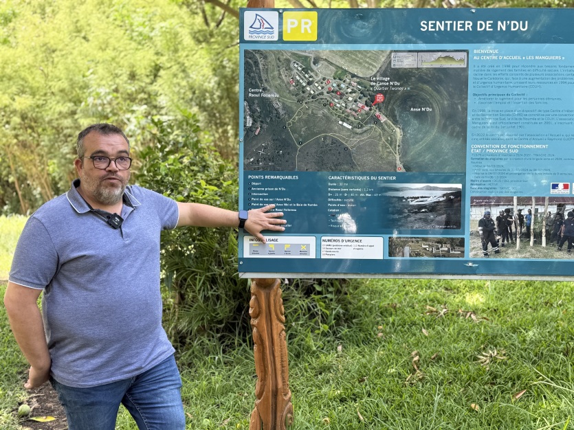 Aurélien Lamboley, directeur de l’association Accueil Les Manguiers, devant le panneau d’information du sentier de N’Du. Photo Aurélia DumtéUne petite randonnée de trente minutes est ainsi accessible à tous, tout le temps : le sentier de N’Du, dont l’entrée est marquée par un panneau rappelant les étapes historiques du site de Numbo. La balade mène sur les traces de l’ancienne prison des femmes du temps du bagne, bâtiment classé par la province Sud et rénové en 2016, longe la tranquille baie de N’Du, passe par l’ancien cimetière des lépreux – aujourd’hui cimetière municipal – et grimpe jusqu’à un point de vue sur les hauteurs. Aurélien Lamboley souhaite enrichir ce sentier avec de nouveaux panneaux retraçant l’histoire du site et recueillant des témoignages.