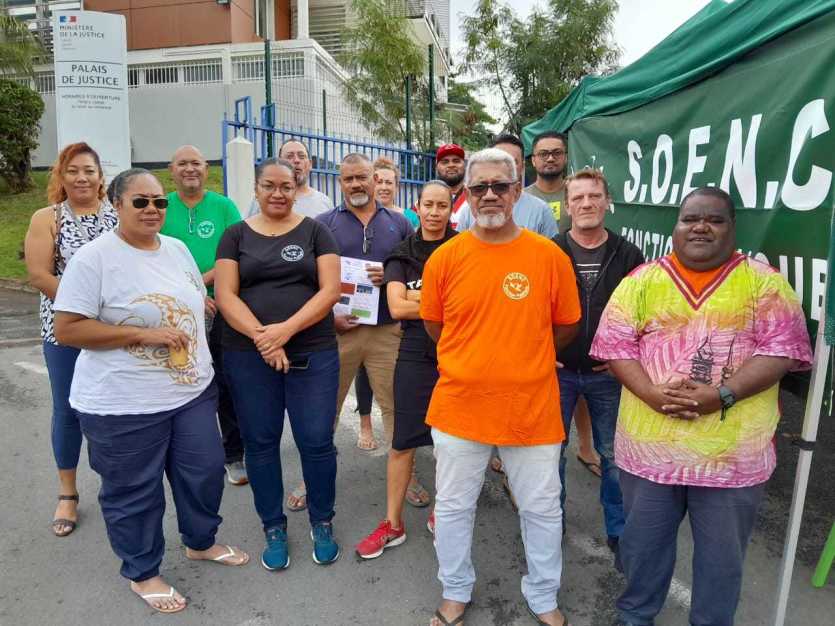 - Anthony Tejero | Crée le 12.04.2024 à 10h50 | Mis à jour le 12.04.2024 à 11h50ImprimerLa section État/centre pénitentiaire du Soenc fonction publique s’est mobilisée ce vendredi 12 avril devant le tribunal de Nouméa. Photo Anthony TejeroUn mouvement d’humeur du Soenc-CFDT a été organisé, ce vendredi matin, devant le tribunal, pour alerter une nouvelle fois sur les "conditions indignes" de détention et de travail au Camp-Est. Le but : réfléchir aux solutions alternatives à envisager pour lutter contre cette surpopulation carcérale d’ici l’ouverture de la nouvelle prison, qui n’est pas attendue avant 2032.