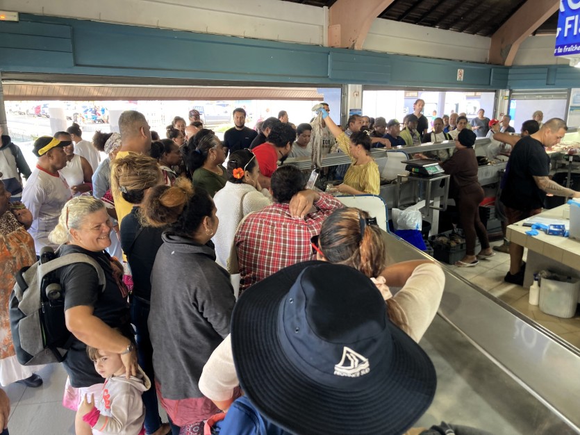 Les stands de poisson ont été pris d’assaut. Photo Baptiste GouretDevant un stand de poissons où se serrent des dizaines de clients, Emma attend dans l’espoir de repartir avec un filet. Elle était à l’agence OPT d’en face lorsqu’elle a appris que le marché était ouvert ce matin. Pour l’habitante de la Vallée-du-Tir, c’est l’occasion de trouver des produits devenus particulièrement rares par chez elle. "Le petit magasin en bas de chez moi a complètement brûlé." C’était le dernier qui vendait du poisson.