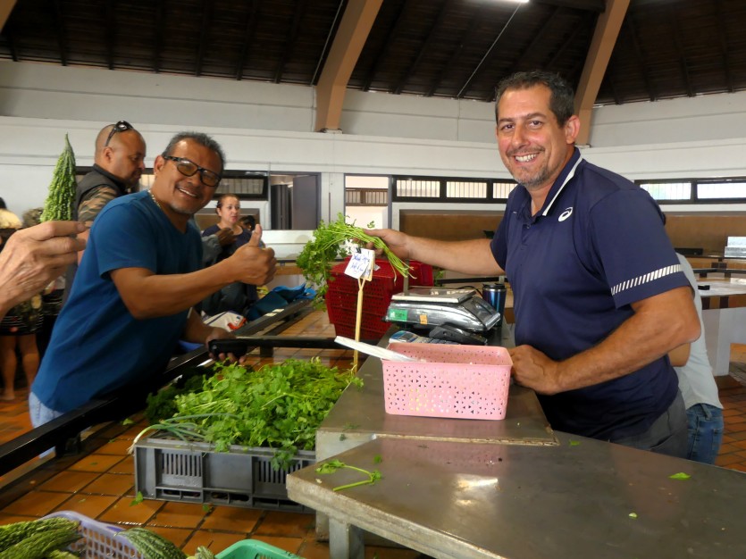 Fred est venu avec sa femme de Boulouparis pour vendre leur production de fruits et de légumes. Photo Baptiste GouretLui qui travaille habituellement dans le BTP est venu donner la main à sa femme, ce matin, et continuera de la faire tant que son chantier à Nouville sera interrompu.