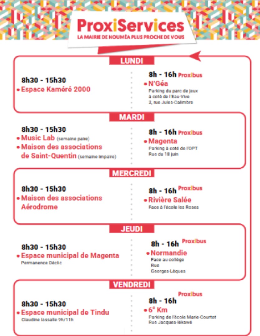 ProxiServices fonctionne du lundi au vendredi, de 8 heures à 16 heures. Information sur le site internet www.noumea.nc et sur le Facebook Nouméa ma Ville. Renseignements au 27 07 02.