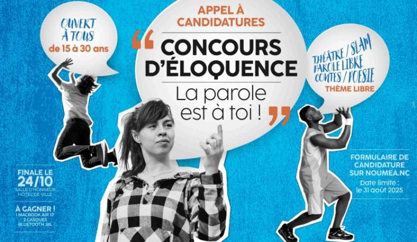 - A.-C.P. | Crée le 29.07.2025 à 06h00 | Mis à jour le 29.07.2025 à 06h00ImprimerLe concours d’éloquence vise à inciter les jeunes à s'exprimer publiquement sur les sujets qui leur tiennent à cœur. Illustration Ville de NouméaLa ville de Nouméa lance les inscriptions pour son concours d’éloquence. Objectif ? Favoriser et soutenir la prise de parole des jeunes de la commune âgés de 15 à 30 ans. Si vous avez envie de vous exprimer, de porter un message, de faire rire ou réfléchir, que ce soit sous la forme de prose, de poésie, du slam ou de conte, vous avez jusqu’au 31 août pour candidater et participez aux présélections avant la grande finale le 24 octobre.
