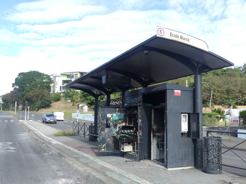 Les systèmes de billetterie ont été saccagés, comme ici dans le quartier de Rivière-Salée.Les dégâts sont considérables sur les réseaux de transports en commun de l’agglomération. Rien que sur la ligne du Néobus, le montant des travaux de réparation se chiffrent, selon les premières estimations, à près d’un milliard de francs, hors voirie.