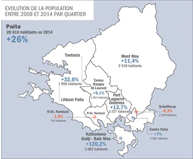 - Païta. Avec 20 616 habitants en 2014, la population communale a augmenté de 26 % depuis le recensement de 2009. Tour d'horizon de cette dynamique démographique, quartier par quartier.Le sud exploseCe n’est pas une surprise. Avec la multiplication de grands lotissements résidentiels, le sud de la commune attire de plus en plus d’habitants. Ainsi pour le secteur de Katiramona-Gadji – qui comprend le récent quartier de Savannah ainsi que de nombreux lotissementsIl vous reste 92% de l'article à découvrir.Cet article est réservé aux abonnés.