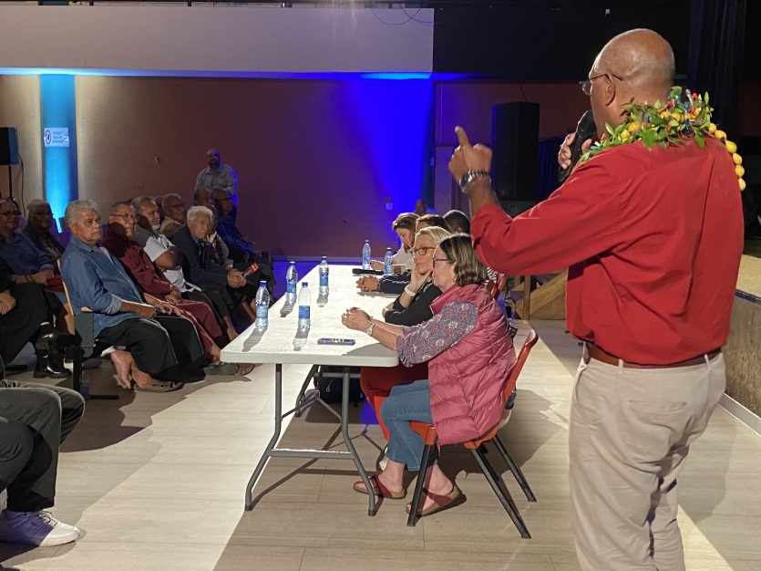 Alcide Ponga ne manque pas de saluer la communauté wallisienne, en commençant par présenter "mon faipule, Petelo, de Kouaoua. La communauté, ça fait longtemps que je travaille avec elle. Avec Petelo (Uhila), on s’est rencontrés et on s’est dit on va aider Kouaoua. On ne s’est pas dit, lui il est Kanak, lui il est Wallisien. Non, on est la communauté."