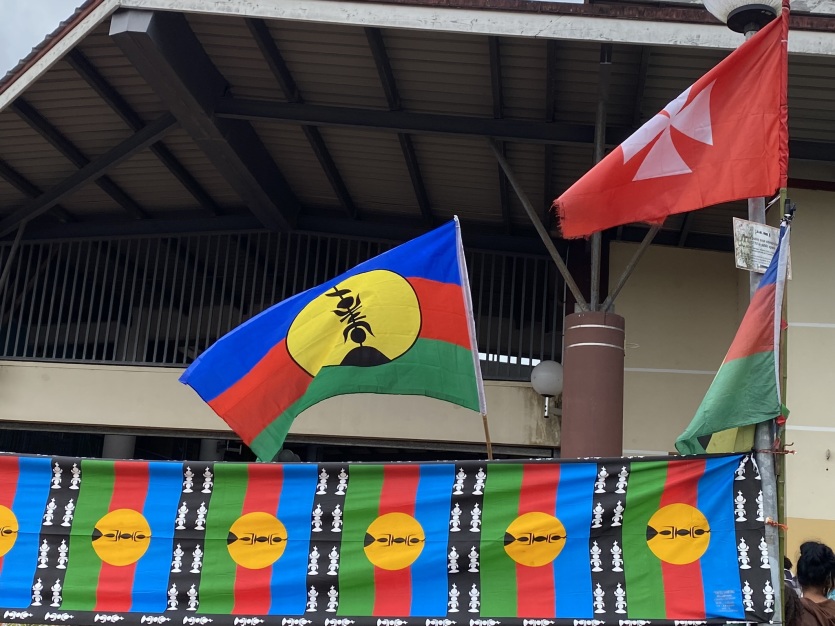 Même commune, même endroit, mais près de 20 heures plus tard, c’est au tour du candidat indépendantiste, Emmanuel Tjibaou, de solliciter la communauté wallisienne. Le bâtiment, toujours surveillé par la gendarmerie, est décoré de drapeaux Kanaky. Un drapeau de Wallis-et-Futuna flotte discrètement au côté du drapeau FLNKS.
