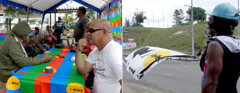 Moins de 100 mètres plus loin, les couleurs (celles du drapeau FLNKS) sont les mêmes mais l’ambiance, elle, est bien différente. Sous les tivolis qui occupent la place du village, les militants boivent le café en famille et accueillent à la table ceux qui veulent discuter. Malgré une revendication commune, le retrait du projet de loi constitutionnelle, tout semble désormais opposer ces deux mobilisations indépendantistes apparues dès le déclenchement de la crise, le 14 mai.