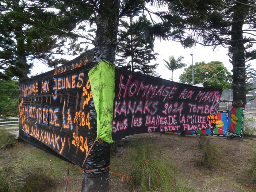 Sur le rond-point de l’entrée du village, des banderoles de la CCAT rendent hommage aux jeunes Kanak tués depuis le début des émeutes. Photo Baptiste GouretAssurer une présence sur le terrain